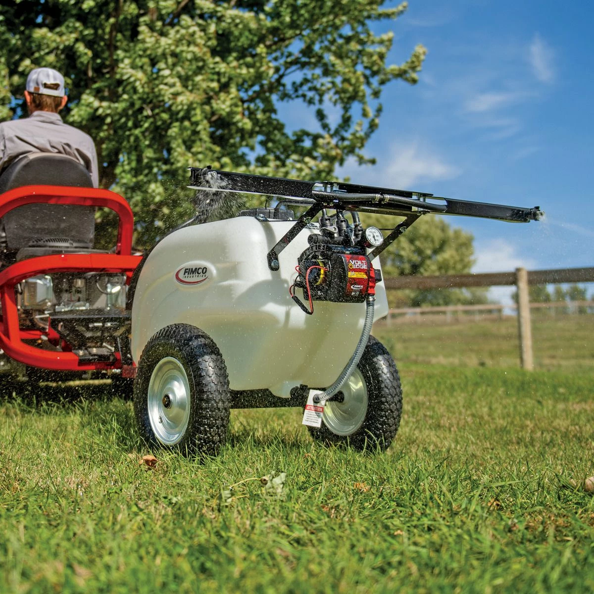 The Volt Edge 30 Gallon Trailer Sprayer represents a major step in 21st Century Lithium Ion Battery powered technology. The polyethylene, UV resistant, high density tank has a 5 inch tethered lid for easy access and is completely drainable. This model features the best in class High Flo High Performance 2.4 GPM with inline fuse protection. The Deluxe Pistol Grip Handgun distributes up to 40 feet of horizontal spray and 25 feet of vertical spray and comes with 15 feet of 3/8 inch hose. The 2 Nozzle Boom offers 7 feet of total spray coverage. Our FIMCO exclusive manifold places pressure control and boom operation conveniently at your fingertips to fine tune your spray pattern. This sprayer sets the industry standard for precision spray technology. A wireless remote and rechargeable Lithium Ion battery removes the need for additional lengthy wires attached to your ATV or UTV battery. Compact, versatile and powerful, the new Volt Edge sprayers are optimized to deliver peak efficiency.