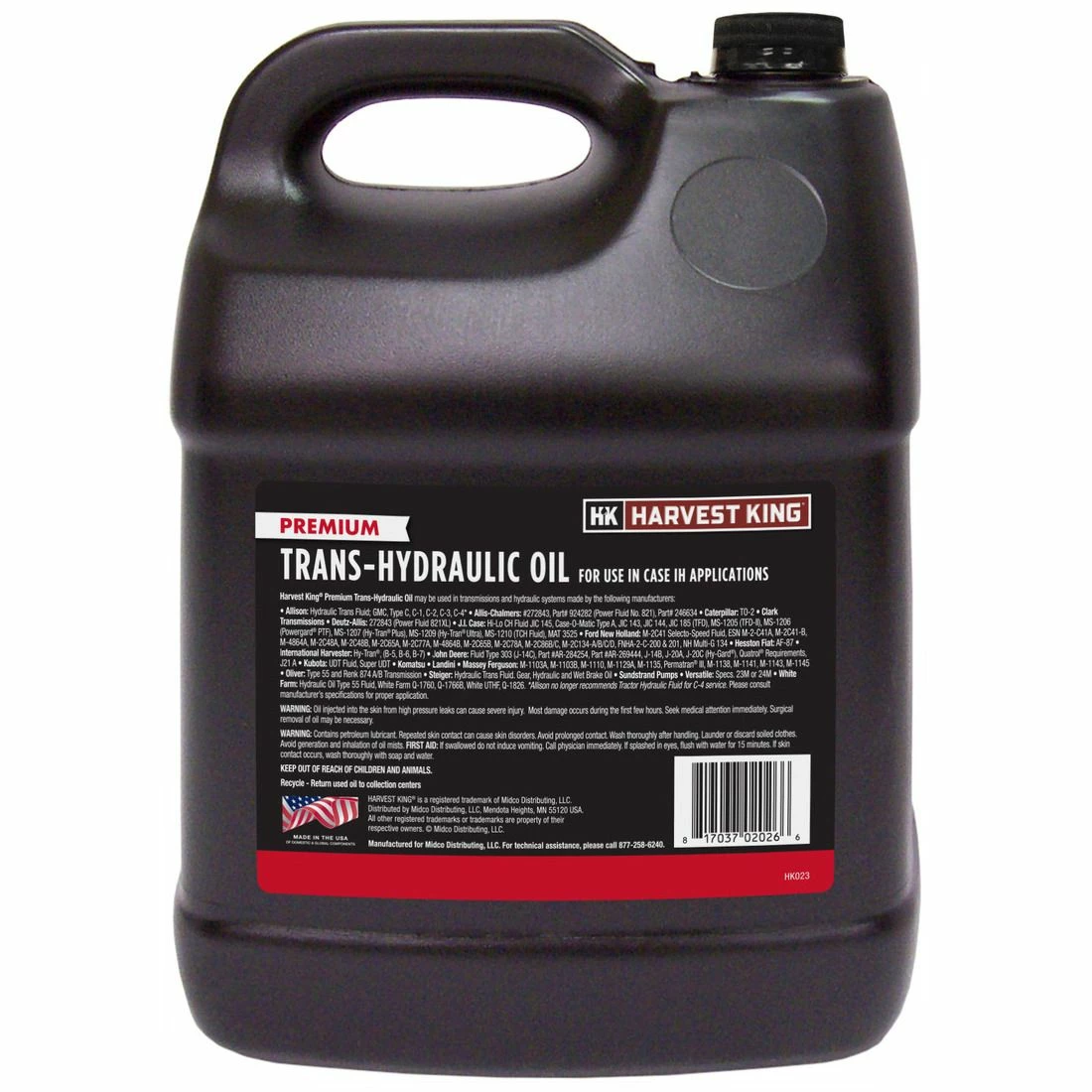 HARVEST KING TRANS-HYDRAULIC OIL FOR CASE IH EQUIPMENT is a high quality, specially designed lubricant containing antirust, anti-foam and oxidation inhibitors; plus other additives necessary for the wide range of applications recommended by various tractor manufacturers. The product is an all-season type of oil that resists thickening in cold weather and thinning in the heat of the summer. It is compounded with detergents to keep transmissions clean and maintain hydraulic control circuits in perfect working condition; and provides excellent protection against seal and pump deterioration. Operators, especially farmers, will appreciate the multipurpose application of HARVEST KING TRANS-HYDRAULIC OIL FOR CASE IH EQUIPMENT for transmissions, final drives, and hydraulic systems of tractors. Check owners manual for proper lubricant selection.